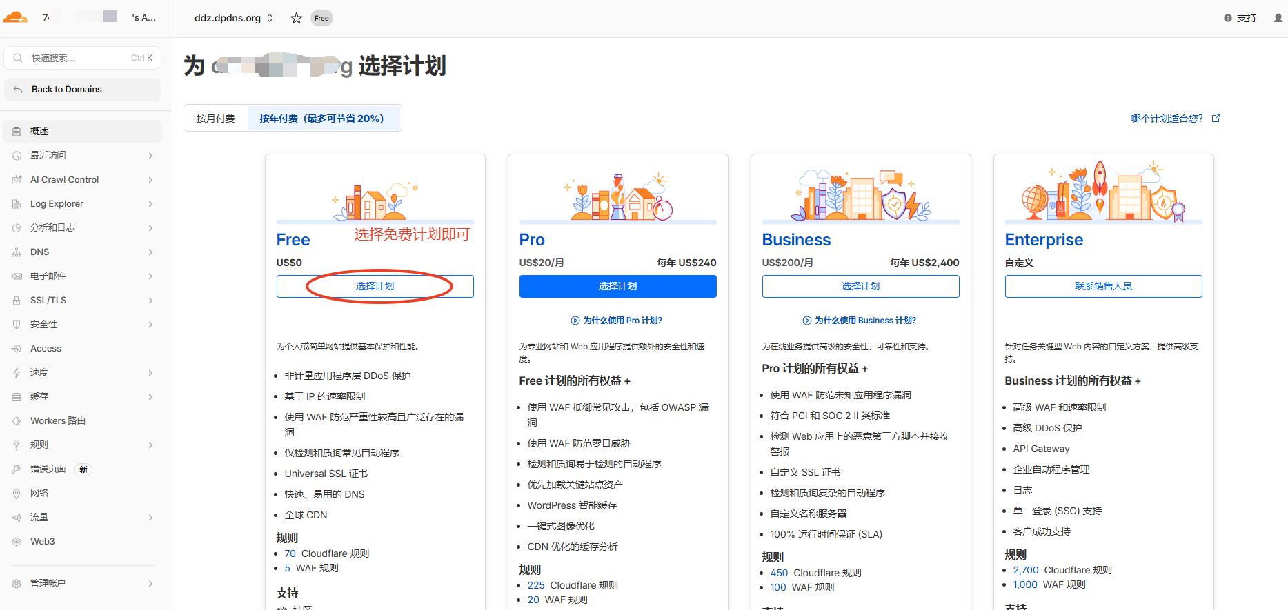 选择Cloudflare的免费计划即可