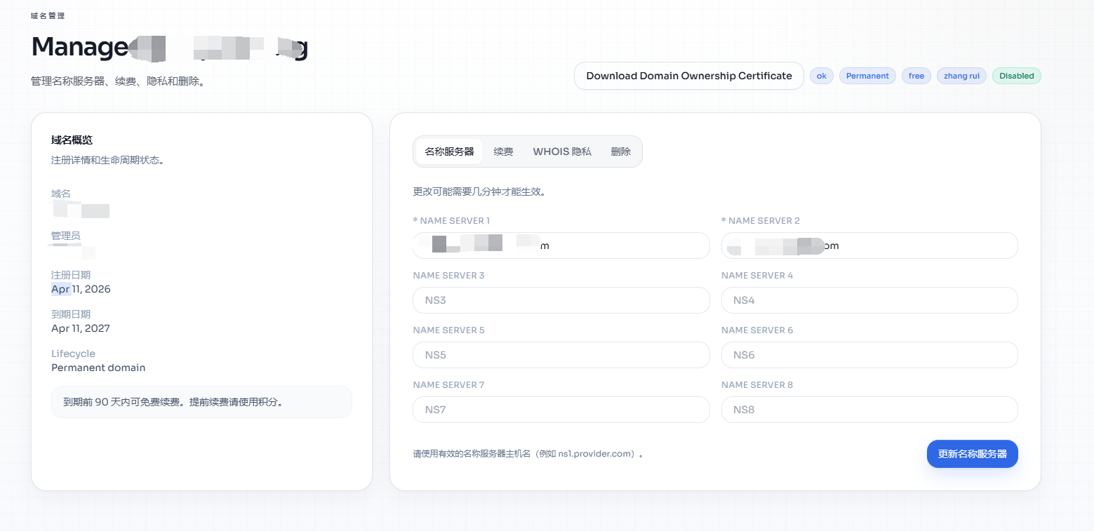 DigitalPlat的域名管理页面,可以看到到期日期,记得即时续约,避免免费域名被回收